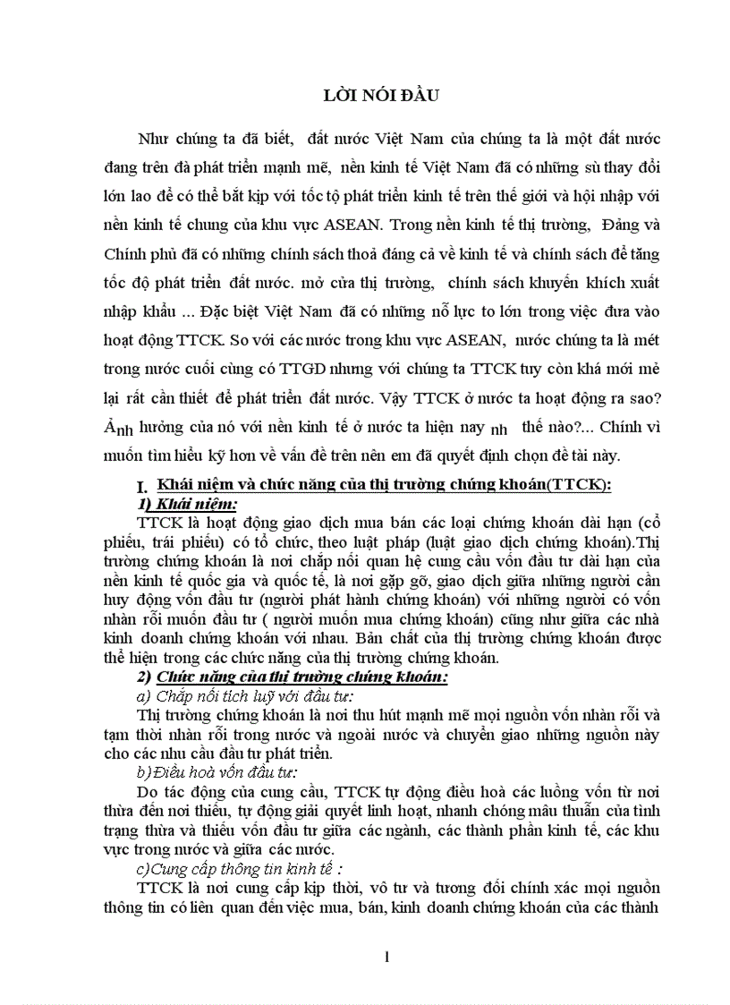 Như chúng ta đã biết, đất nước Việt Nam của chúng ta là một đất nước đang trên đà phát triển mạnh mẽ, nền kinh tế Việt Nam đã có những sự thay đổi lớn lao để có thể bắt kịp với tốc tộ phát triển kinh tế trên thế giới và hội nhập với nền kinh tế chung của khu vực ASEAN. Trong nền kinh tế thị trường, Đảng và Chính phủ đã có những chính sách thoả đáng cả về kinh tế và chính sách để tăng tốc độ phát triển đất nước. mở cửa thị trường, chính sách khuyến khích xuất nhập khẩu ... Đặc biệt Việt Nam đã có những nỗ lực to lớn trong việc đưa vào hoạt động TTCK. So với các nước trong khu vực ASEAN, nước chúng ta là một trong nước cuối cùng có TTGD nhưng với chúng ta TTCK tuy còn khá mới mẻ lại rất cần thiết để phát triển đất nước. Vậy TTCK ở nước ta hoạt động ra sao? Ảnh hưởng của nó với nền kinh tế ở nước ta hiện nay như thế nào?